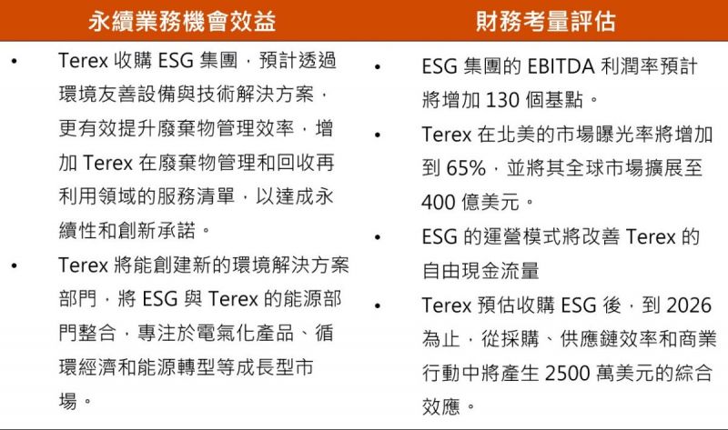 以紐約證交所上市公司Terex為例 ,該公司原本專精於廢棄物處理與再利用等環境服務,近年因應循環經濟趨勢,積極規劃收購 ESG 集團(Environmental Solutions Group)。在正式收購前,Terex 即展開全面的永續業務與財務評估,審慎考量此次交易的短、中、長期財務效益與氣候相關機會: