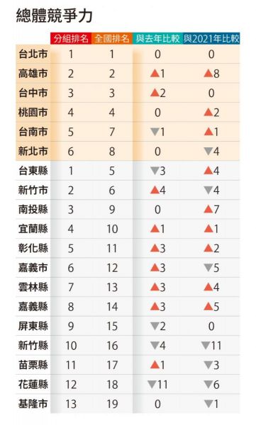 ● 總體競爭力:台北市全台第一、台東縣一般縣市第一