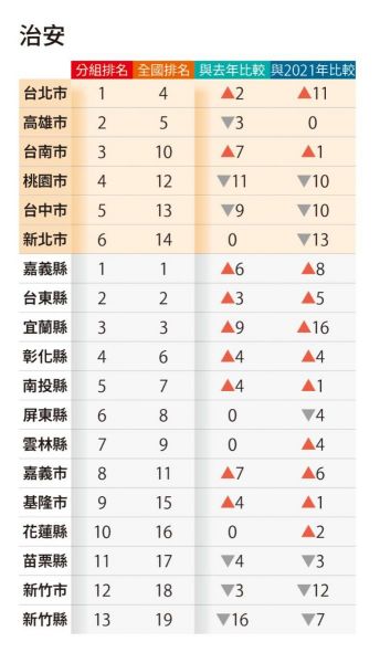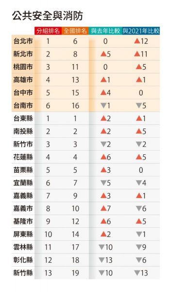 至於東台灣,宜蘭縣成為「治安躍進之城」,「治安」4年內大幅進步16名,全台進步最多;另外,「社會福利」較2024年進步3名。花蓮縣是「公安躍進之城」,「公安與消防」4年內進步5名,為一般縣市組進步最多。