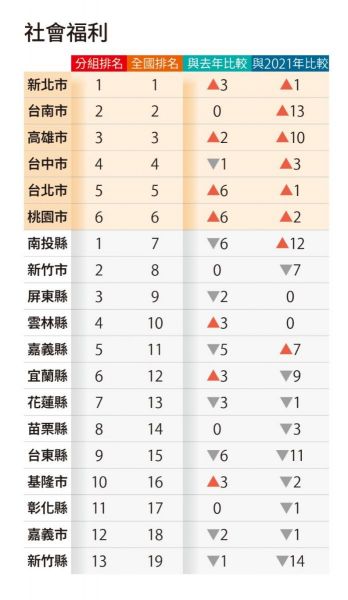 社會福利:新北全台第一、台南進步最多