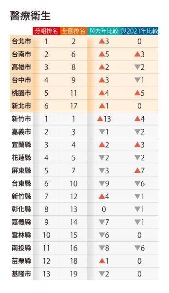 「再生能源裝置容量成長率」為淨零轉型的風向球,由彰化縣取得第一。攸關醫療量能的「每萬人口病床數」,嘉義市名列第一。而要觀察城市治安,「無被害人刑案主動查處率」能有效反映警政人員的積極程度,今年第一名為嘉義縣。