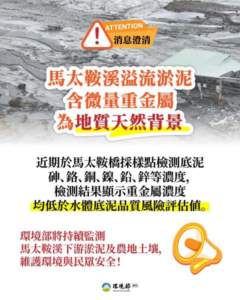 而馬太鞍溪沖下的淤泥,母岩性質原本就含有微量重金屬,是地殼天然背景造成。環境部表示,這並非人為汙染,請民眾不要擔心。