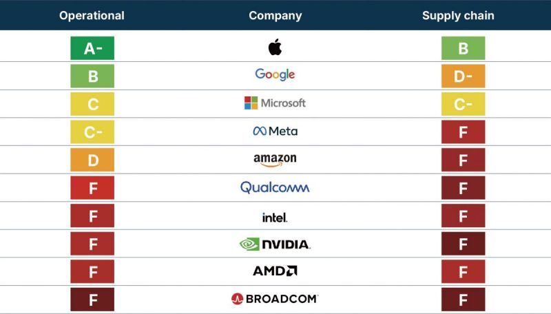 綠色和平東亞分部10月29日發布《供應鏈改革:追蹤AI巨頭的減碳之路》報告,首次針對AI產業在營運與供應鏈端的減碳行動進行系統性分析。報告指出,AI熱潮背後潛藏著高能耗與高排放的隱憂,全球前十大AI公司,包括Apple、Google、Microsoft、Meta、Amazon、NVIDIA、AMD、Broadcom、Qualcomm與Intel等在減碳表現上差距懸殊。Apple以B+評級居首,但其餘企業多數不及格,突顯AI產業「科技創新」與「氣候行動」之間的落差。