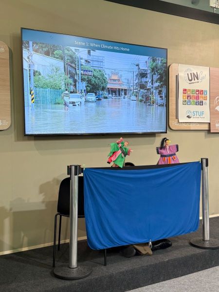 而這次世台基金會也廣邀青年到巴西實地參與COP30,甚至有青年因為不斷轉機而延誤行程,因而錯過到貝倫的班機,因此世台緊急調度他們飛到聖約翰機場,再安排車輛接駁,一行人搭了18個小時的車才來到貝論COP30會場,中間還看到因保育不當而引發的雨林火災,一趟勇闖COP30的驚魂記也見證了氣候變遷衝擊。而這些台灣青年也發揮創意,在綠區永續行動館用布袋戲演繹今年夏天颱風帶來水災的故事,對國際訴說台灣因應大自然挑戰的韌性。