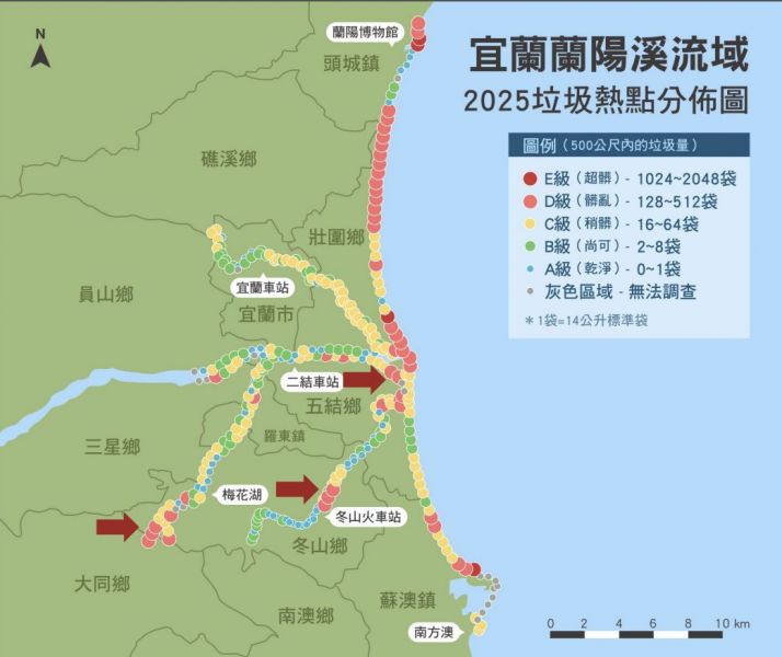 整體來看,蘭陽溪河岸的整潔度表現相對理想。調查顯示,河岸段平均每公里約出現 81 袋垃圾,汙染程度被評為 C 級,也就是「稍髒」的程度。累計垃圾量約 30.8 萬公升,顯示地方政府與在地居民長期維護已有成效,河川環境大致保持良好。