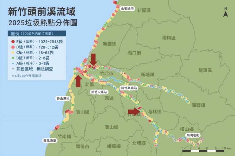 不過,調查也發現新的汙染熱點開始浮現。頭前溪出海口的舊港大橋下、國道三號橋下方,以及鳳山溪右岸都出現新的垃圾堆積。這些地點多靠近交通匯集處或人口聚集區,顯示只要人流頻繁、活動量大,河川廢棄物仍可能持續增加,汙染並不會因清理而完全消失。