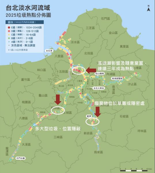然而,新納入的調查區域也揭露新的問題。部分靠近住宅區的支流竟成為大型家具及成袋垃圾的棄置點,生活廢棄物堆積情況嚴重。大漢溪右岸與北勢溪也出現不易察覺的隱性垃圾堆積,汙染藏於河岸植被與堆土之間。此外,過去年年被點名的關渡大橋、蘆洲與社子島等地,今年仍呈現持續累積的趨勢,需要更完整的管理策略與巡查規模。