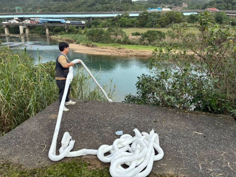 基隆河八堵抽水站附近河面11月27日出現油污,環保局獲報後啟動緊急應變與稽查作業,並在河面上布設攔油索。基隆市政府