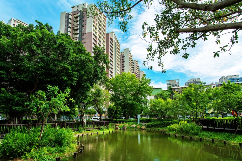 社區擁有150%高綠覆率,綠化面積達59,219平方公尺,每年約可達到 2.8 萬公噸的二氧化碳固碳量,同時透過自然風廊的設計與再生能源使用,每年可再減少3,001公噸的二氧化碳排放量,有效減少社區整體能源消耗。社區緊鄰 2.5 萬坪公園綠地,以高綠化、基地保水與氣候調節等設計,有效弱化都市熱島效應,提升居民舒適性與社區氣候韌性,打造與自然共融的宜居典範。