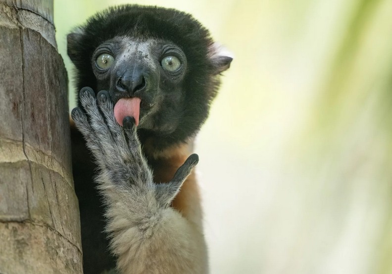 作者分享:「這隻瓦氏冕狐猴(Propithecus deckenii)像舞台劇演員般優雅,又像喜劇演員般抬起爪子,若有所思地舔了舔,然後在動作中短暫停頓,就好像完全清楚自己在做什麼。