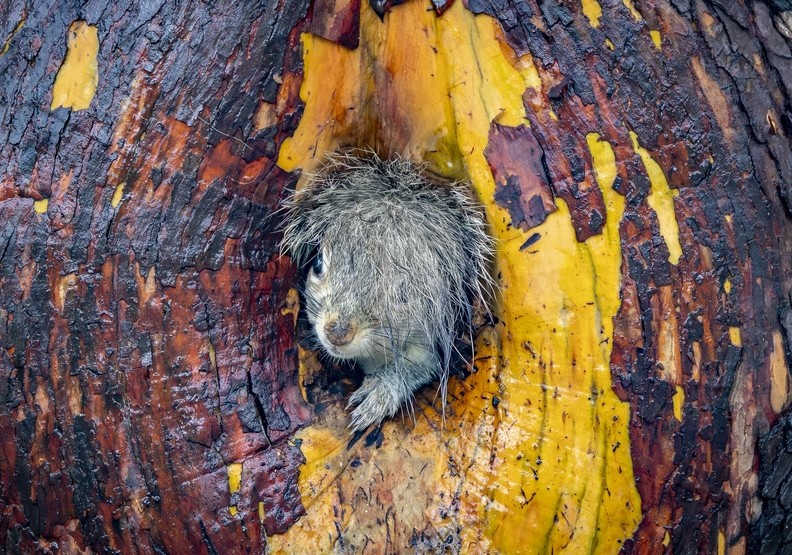 作者分享:「拍攝這張照片時,我正在市中心的一個公園裡,突然看到一抹灰色的身影跑過。走近一看,原來是一隻灰松鼠媽媽正在把她的幼崽搬到新巢。那天早晨草地上帶著露水,她在草叢中奔跑時尾巴全都濕了。當她進入新巢時,尾巴還伸在外面,當她轉身離開的短短一瞬間,她的頭竟被濕漉漉的尾巴蓋住了。