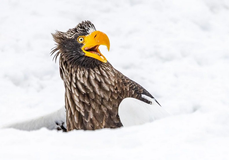 作者分享:「我拍下這張照片時,這隻虎頭海鵰正坐在深雪中的一個洞裡。牠嘴裡叼著一條魚,飛到防波堤上,發現了這個新落雪堆出的洞。其他海鵰從牠上方飛過、逐漸靠近時,我正好捕捉到牠回望的那個眼神,牠的表情清楚得不能再清楚:絕不可能把魚讓出去。」