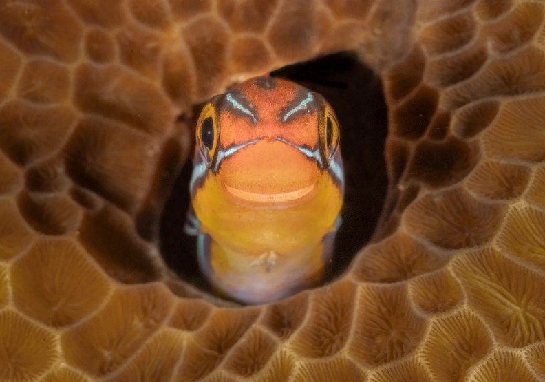 作者分享:「在菲律賓(Philippines)進行水肺潛水時,這條小魚不斷從牠的家,一個鑲在珊瑚紋理中的小洞探出頭來,我拍了幾張照片,牠那張調皮的笑臉真的是太可愛了、太豐富了!」