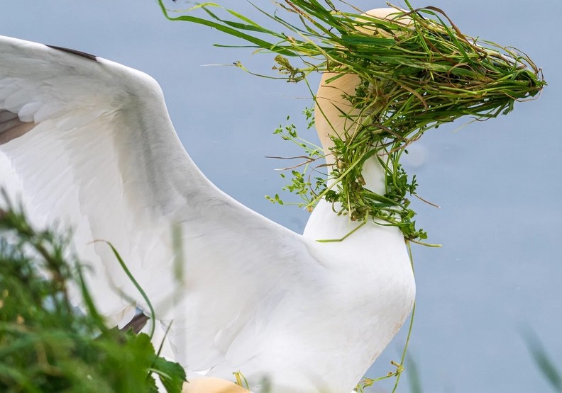 當其中一隻塘鵜在懸崖頂部收集築巢用的草時,強風吹得草直往牠的眼睛飄去,使得牠不但起飛困難、連辨別方向都更加具有挑戰性。」