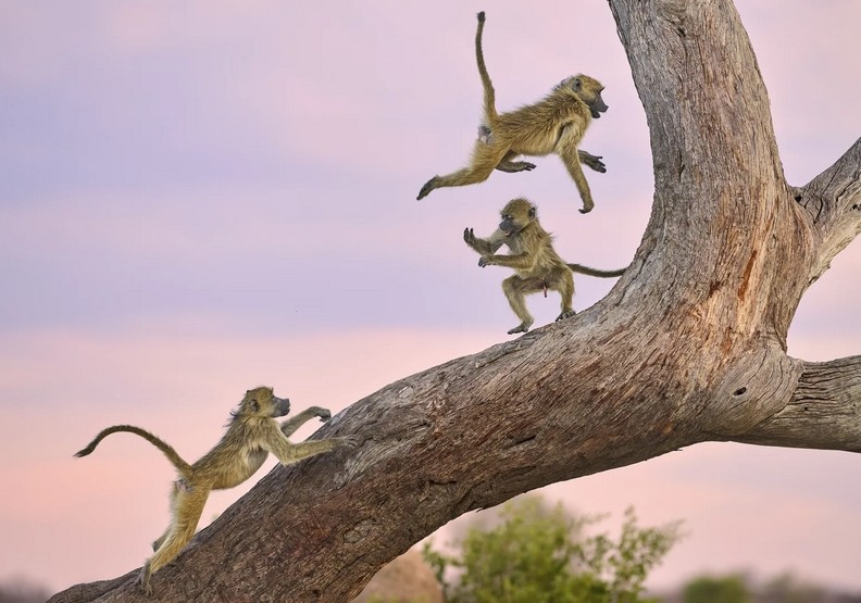 作者分享:「我和妻子正在辛巴威(Zimbabwe)的萬基國家公園度蜜月,有一天傍晚,回營地的路上,我們偶遇一群在一棵大樹上玩耍的狒狒,其中一隻狒狒坐在粗大的樹枝上,而其他的則沿著樹上下奔跑,繞著樹轉圈。