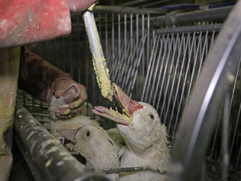 還有,老饕們最愛的肥肝,則是碧姬芭杜抗議的另一個重點。在鴨或鵝被屠宰前的最後2~3週,養殖者會將一根20~30公分長的金屬或塑膠管強行插入其喉嚨深處,每天2~3次灌食大量玉米漿,這些食物的量遠遠超過動物自願攝取的極限,相當人類每天被迫吃下十幾公斤的義大利麵。