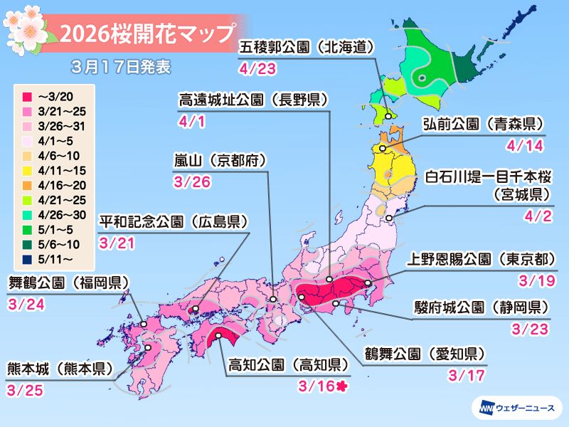 根據Weather Map預測,日本各大城市2026年櫻花開始綻放時間分別是: