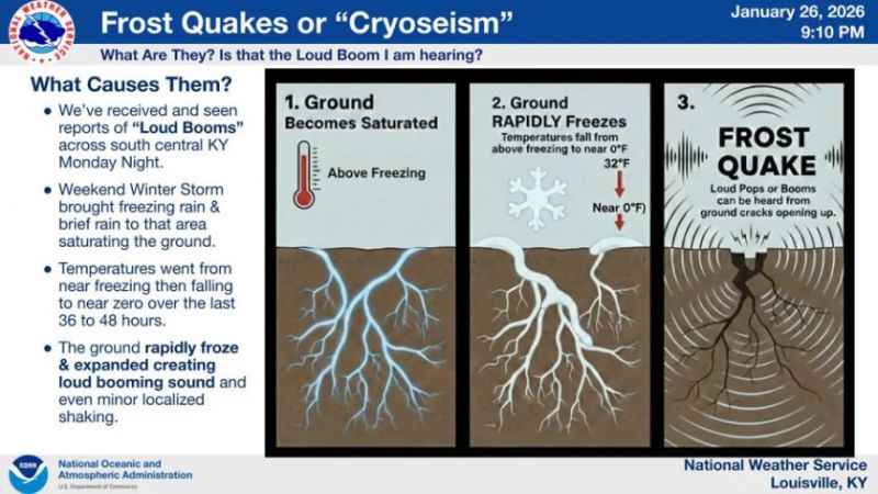 隨著冬季風暴席捲美國,肯塔基州等地的居民聽到如爆炸般的神秘巨響。氣象專家指出,這種巨響不是超自然現象,而是一種被稱為「霜震」(Frost Quakes)的自然現象。