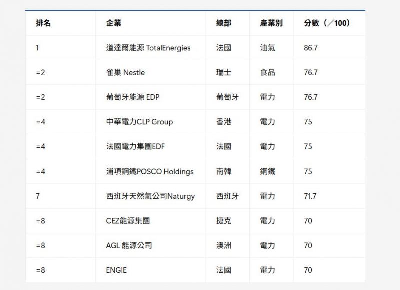 在全球範疇中,電力與能源產業因面臨極高的監管壓力與轉型急迫性,其規劃相對完備,評分前十名的企業中有八間屬於此類產業。法國道達爾能源(TotalEnergies)被視為模範生,承諾依據國際勞工組織原則進行轉型,也針對員工、社區與供應商設定了2025至2030年的具體目標,例如承諾在不裁員的前提下轉型煉油廠,並推動全球技能簽證計畫(Visa for TotalEnergies)以協助員工適應去碳化挑戰。