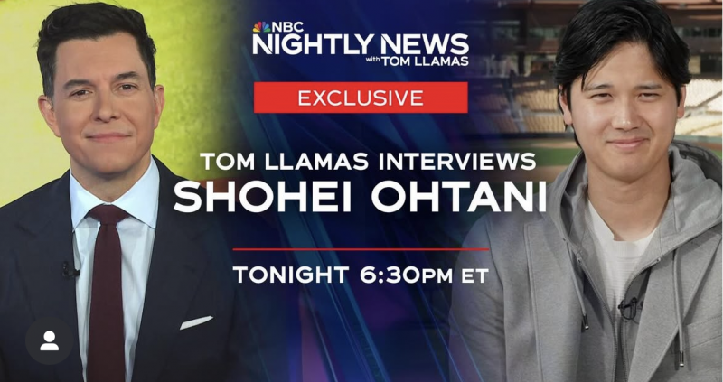 大谷是史上第一位登上美國三大電視網晚間新聞的日本球員。專家分析,過去在紐約洋基隊打球的松井秀喜曾經上過晨間新聞,但晨間新聞時間較長、氛圍也較輕鬆,而晚間新聞只有半小時,扣掉廣告時間甚至只有20~25分鐘,主要報導國內外較嚴肅的政經大事。大谷能在NBC晚間新聞接受專訪,顯示他的影響力已超越運動範疇,成為普遍的社會文化現象。