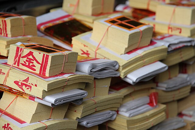 - 紙錢:所有祭祀用紙的統稱,涵蓋獻給神明、祖先及鬼魂的各種形式。依祭祀對象不同,可細分為金紙、銀紙、庫錢等類別,是華人社會溝通陰陽的媒介。