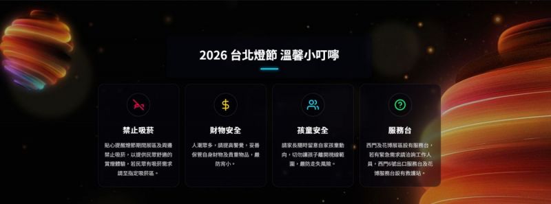 - 全區禁菸:台北燈節今年於西門與花博兩大展區實施「全面禁菸」,僅在外圍規劃5處臨時吸菸區
