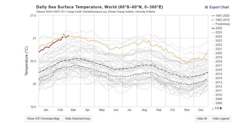 從NOAA監測資料顯示,3月7日全球平均海表溫度為21.06℃,比1991年至2020年的氣候平均值高出0.54℃。