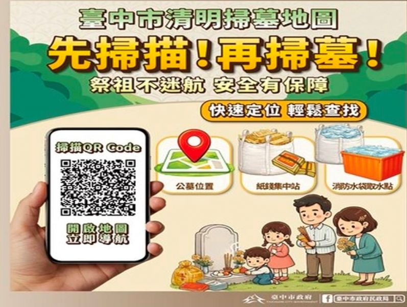地方政府也同步推出配套措施。台中市政府在今年整合全市公墓資訊,推出「清明掃墓地圖」,提供公墓位置、紙錢集中處及消防水袋取用點等資訊,方便民眾查詢與導航。