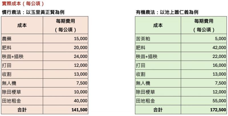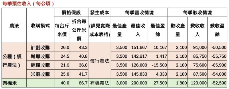 以最有利的計劃收購價計算(全台灣的收購價都是一樣的,無分產區),乾穀每台斤26元,折算成米僅約每公斤43元。一位花東稻農每公頃每季最好的情境下,一季收入約15萬1000元,但成本也要14萬1000元,盈餘僅剩1萬元左右。若要養活一家人,至少得耕作10公頃,一年總盈餘也不過10到25萬元,遠低於2026年最低工資標準換算的年薪36萬元,而這還不包含農民自身的勞動成本、管理費與家庭基本開銷。