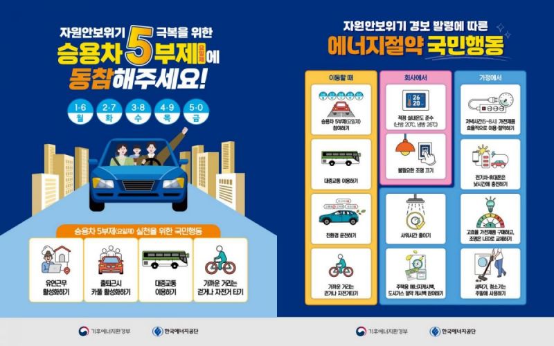 氣候能源環境部長金星煥24日召開政策簡報會表示,為了讓公共部門能帶頭實踐節約能源,將強制執行公共機關自用小客車5部制。車輛限行5部制以「星期制」實施。