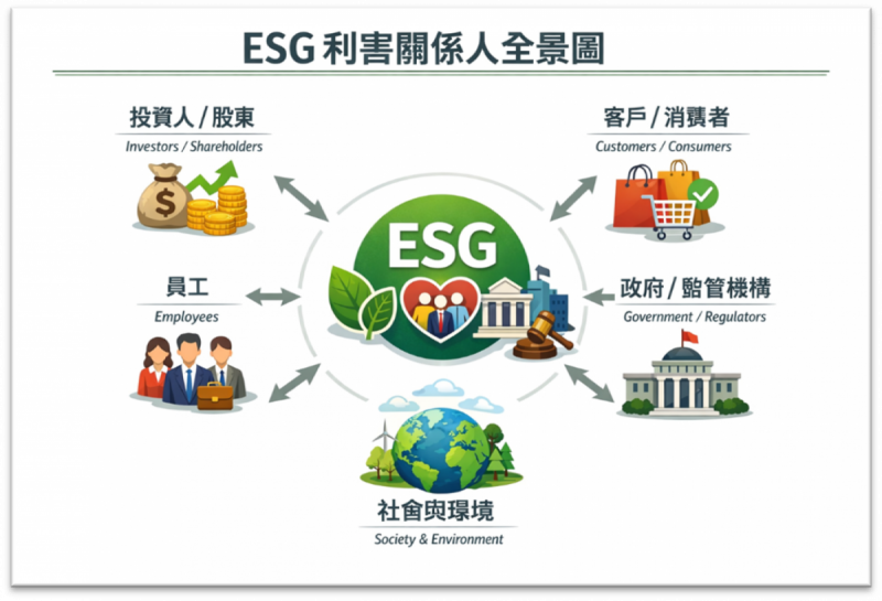 事實上,ESG是企業營運思維的翻轉,從以前的滿足股東(Shareholders)及短期利潤,逐步轉至兼顧更多「利害關係人」(Stakeholders)的意見。