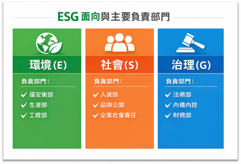 過去坊間常見迷思是:ESG只是環安衛或公關的事,其他部門等著被交辦(看戲)就好。