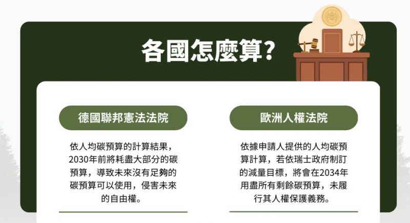 她進一步指出,國際間已出現以「氣候訴訟」促使政府提高減碳承諾的案例,例如荷蘭與德國,公民透過司法途徑成功要求政府強化氣候政策。但在台灣,現行制度下,人民對政府氣候作為的司法監督仍相對有限,使氣候治理缺乏外部制衡機制,「在全球氣候治理逐漸走向法治化的趨勢下,台灣若未補強相關制度,將可能逐步被邊緣化。」
