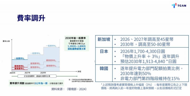 趙家緯也提醒,從日韓經驗來看,企業遊說往往會影響制度設計,進一步壓低碳價或擴大免費配額,「這些都是台灣在設計制度時必須正視的風險。」