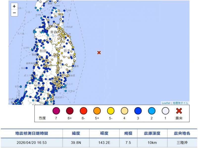 日本4/20發生規模7以上之強震,引發熱議。擷取自日本氣象廳