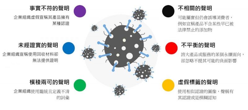 漂綠表現形式多樣,從公然欺騙到溝通不當,甚至是設定不切實際的永續目標等,都屬於漂綠的範疇 。漂綠以以下六種類型最為常見: