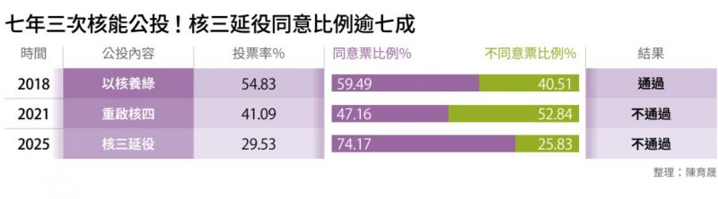 攸關台灣能源發展、淨零排碳、安全韌性的核三重啟公投落幕,儘管同意票高達434萬1432票,足足是不同意票151萬1693票的兩倍多。同意票的比率高達74.17%,顯示台灣多數民意支持核能發展。
